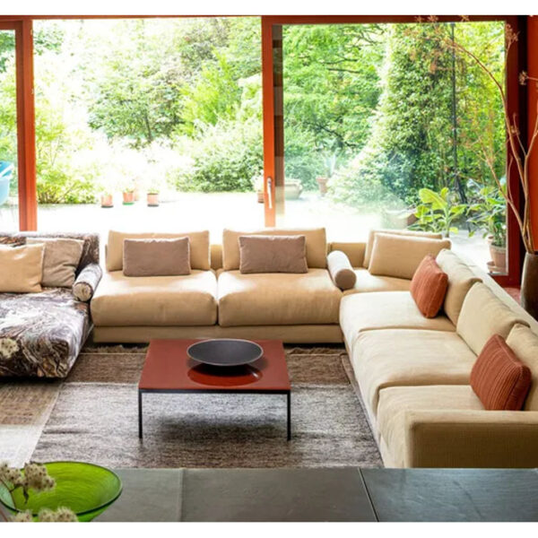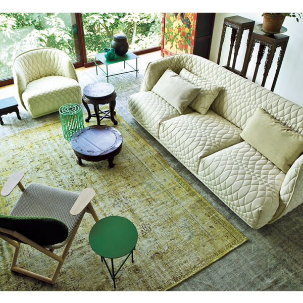 Gogan, sofa by Patricia Urquiola, the Gogan collection takes its name from nature and in particular from Japanese stones rendered smooth by time and water, which provided the inspiration for this project. The seats are soft and irregular with the centre of gravity being slightly inclined towards the rear. This gives exceptional comfort and allows the backrest to be kept lower. The backrest and seat are joined by abutments, which lend the sofa a sense of lightness, so that it appears as if it was suspended above the ground.