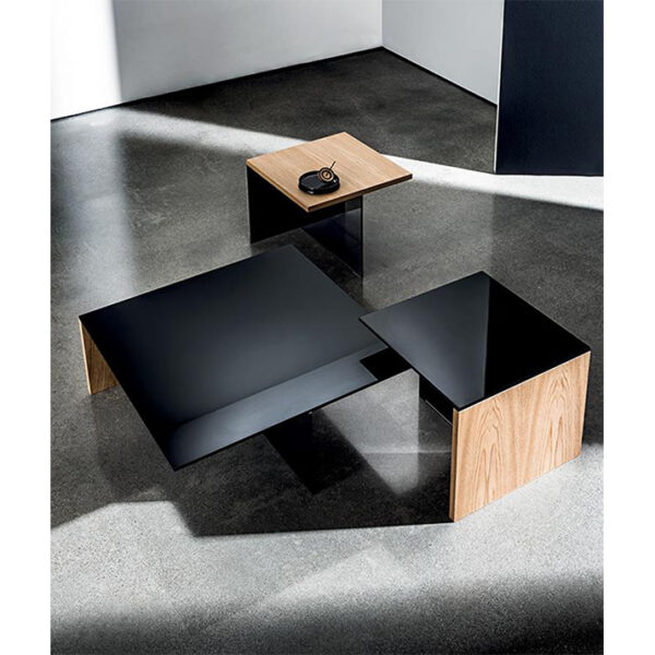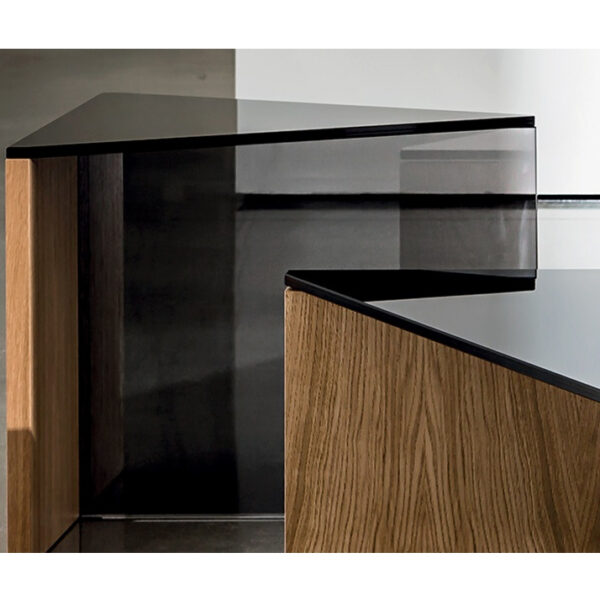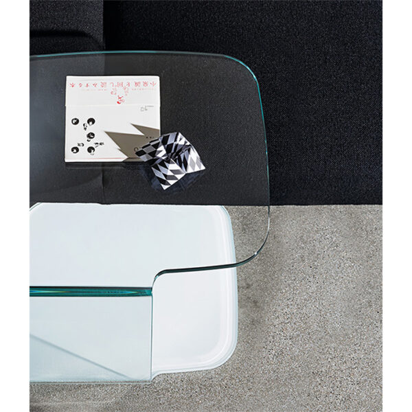 Bent glass coffee table lacquered mono or two-tones or in extralight glass with lacquered bottom part.