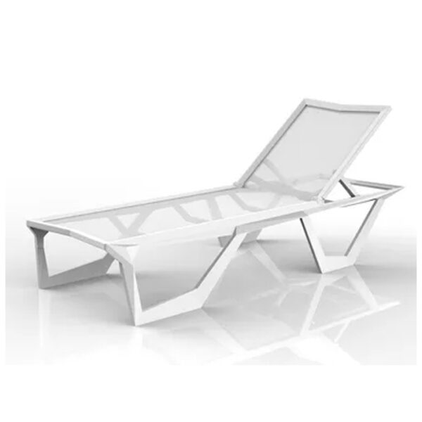 Ibiza sun lounger by Eugenie Quitllet, made from polypropylene and reinforced with fiberglass manufactured by gas injection. Stackable . Available in white color. Suitable for indoor and outdoor use. In addition, the “Vondom Revolution” finish means it is made from 100% recycled plastic from the Mediterranean sea.