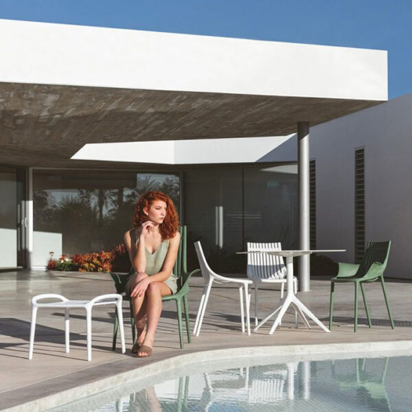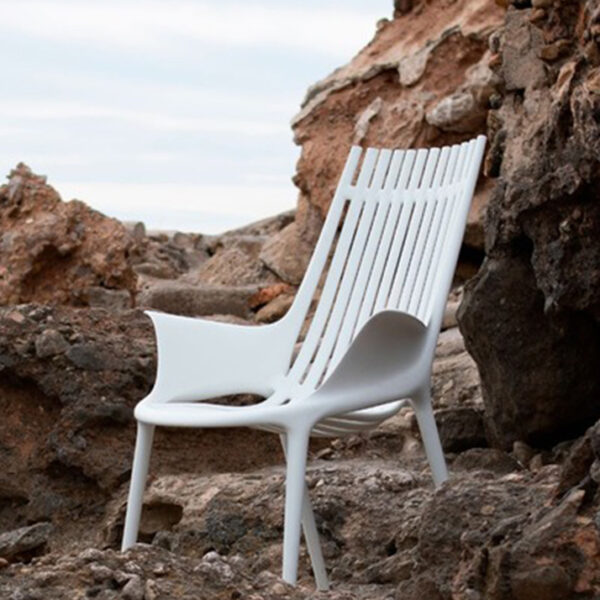 Ibiza lounge chair by Eugeni Quitllet, made from polypropylene and reinforced with fiberglass manufactured by gas injection. Stackable. Suitable for indoor and outdoor use. In addition, the “Vondom Revolution” finish means it is made from 100% recycled plastic from the Mediterranean sea.