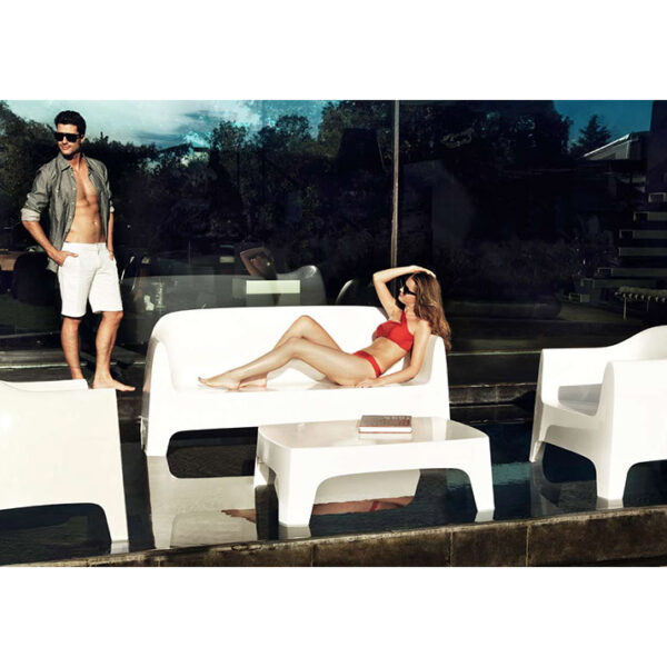 Solid sofa, made of injected polypropylene with mineral additives. Stackable. Available in white. Item suitable for indoor and outdoor use.