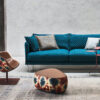 Gentry, sofa by Patricia Urquiola. Injected flame-retardant polyurethane foam and polyester fiber over internal steel frame. Front-back to-leg base is tubular steel with chrome or varnished steel powder coat finish. Seat cushions are in goose down over polyurethane foam. Back, armrest and optional cushions are goose down.