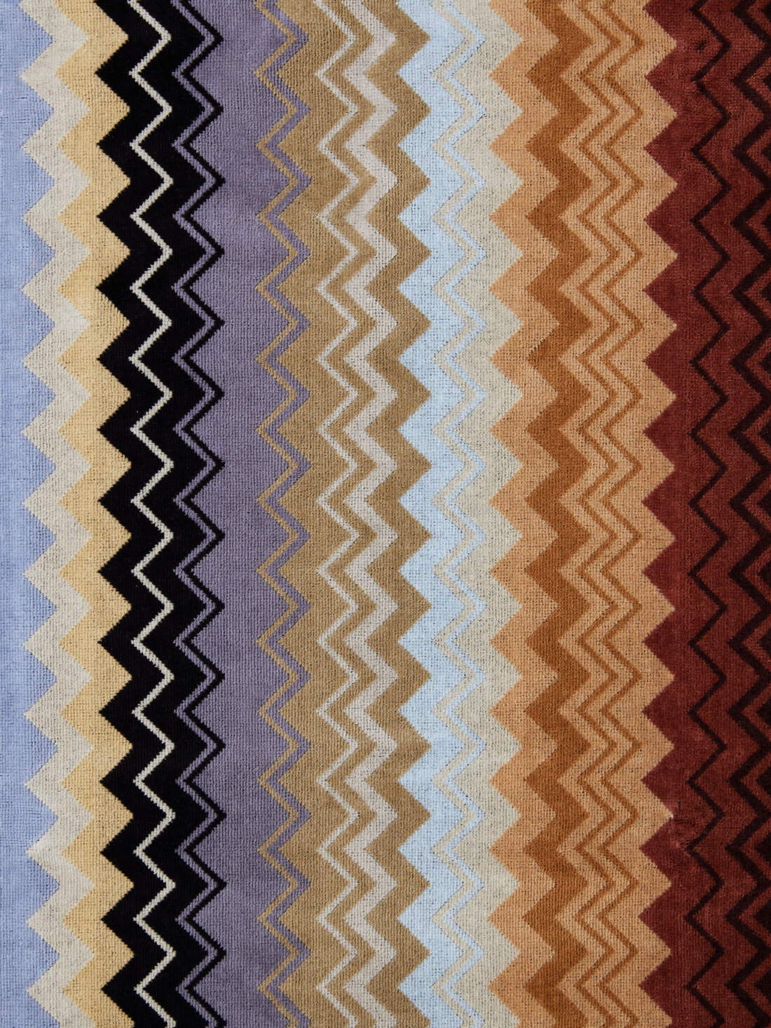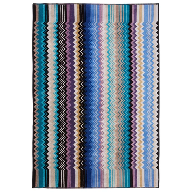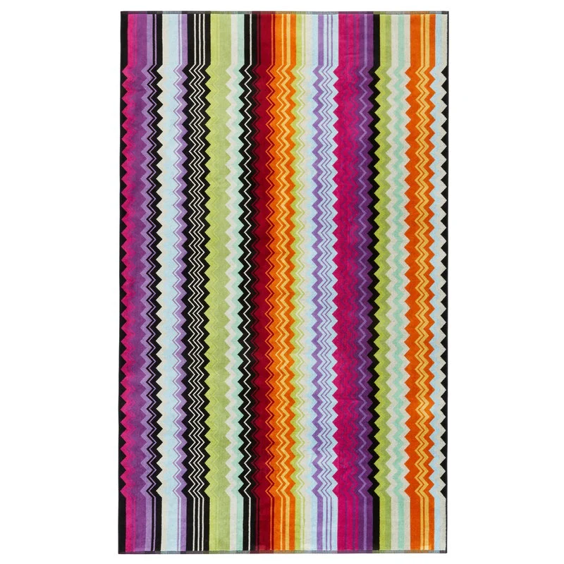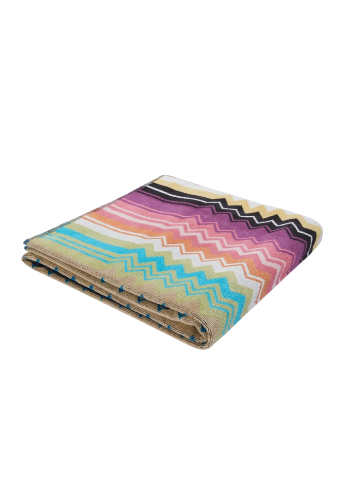 The 100×150 cm Giacomo bath towel is the quintessence of Missoni style: here the quality of the velour cotton terry meets the definition of the chevron print, which dips into the striped edges to enliven this beautiful and timeless linen accessory.