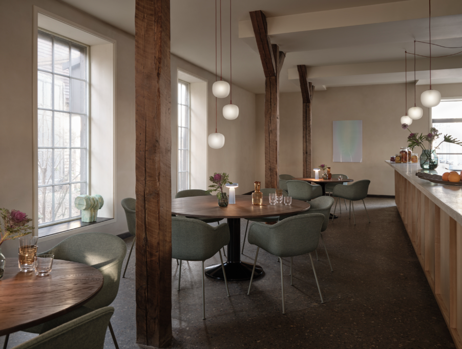 A natural focal point of the home, the Midst Table is a generous, round dining table where friends and family gather—with room to welcome more. Its refined silhouette is simple yet characteristic, enhanced by distinct detailing and contrasting materiality—matte solid oak, linoleum, or honed marble on a monolithic base made of spun steel with a durable high-gloss finish.