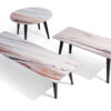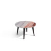 It draws energy from the contrast between the intentionally artificial-looking marble-effect top and the powder-coated black metal base, with its clean but aggressive lines. Available in two shapes.